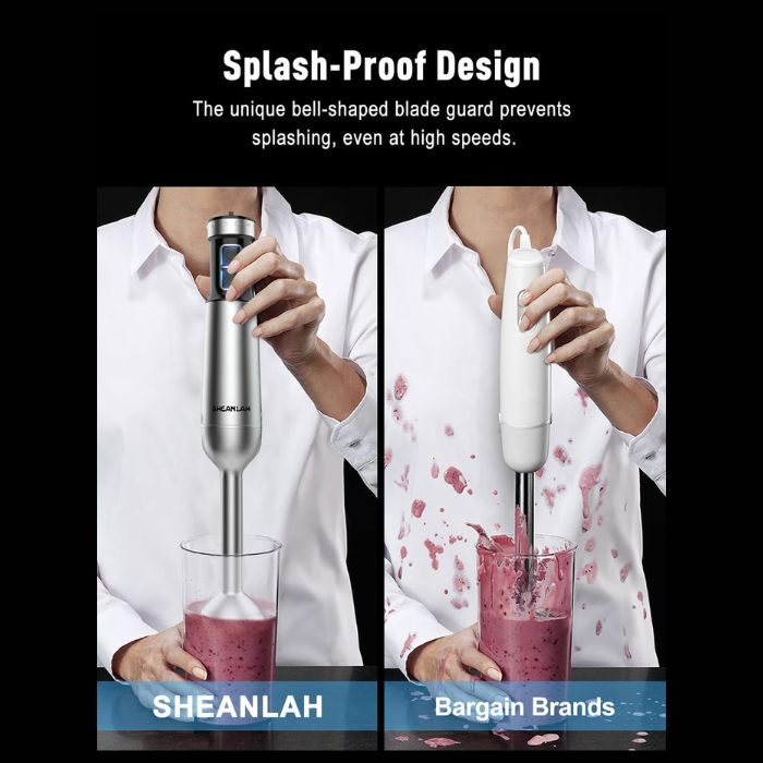 - Our immersion blender features a unique bell-shaped blade guard that prevents splashing and protects your containers from scratches, keeping your kitchen clean and your cookware looking new.