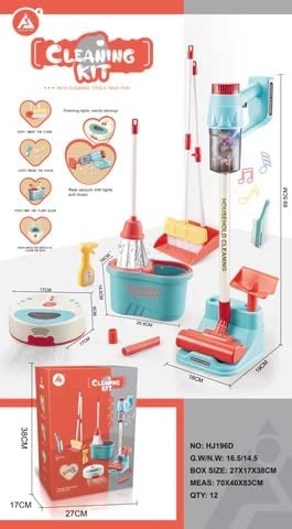 • 12 pcs Children’s cleaning toy set: The toy set includes a watering can, a brush, a broon, a dustpan, a sweeping robot, and a vacuum cleaner with three different nozzles and extension tubes. The box size is 38*27*17 cm.