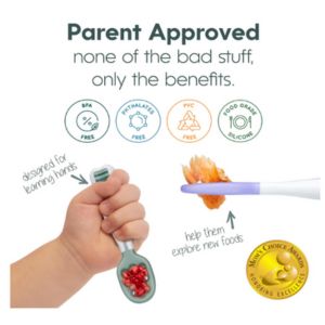 • These spoons help teach the skills and motions needed to graduate to a traditional spoon, without requiring wrist rotation to use – a skill children typically don’t develop until 2 years old.